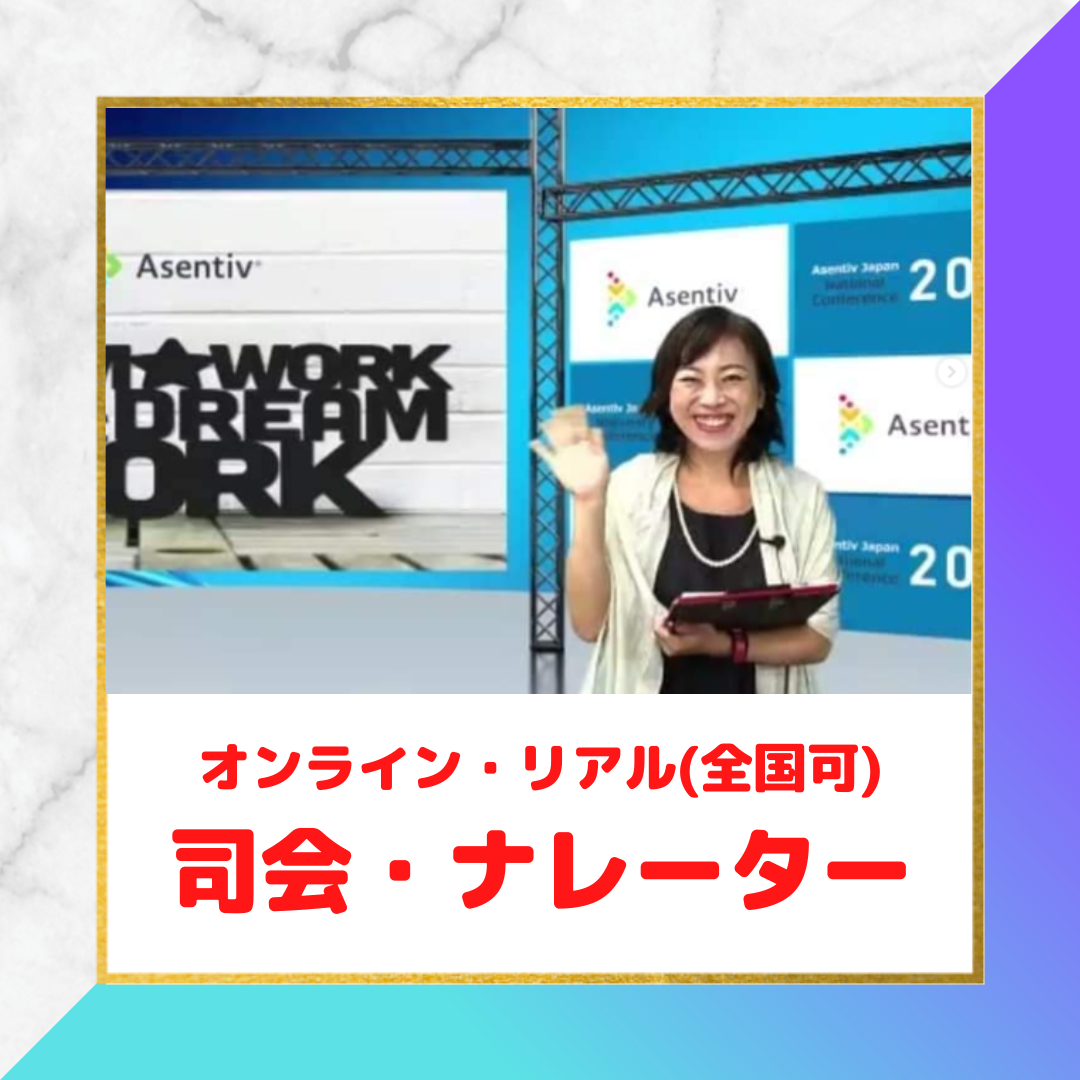 イベントMC・インタビュアー・選挙ウグイス・セミナー司会・ナショナルカンファレンス司会・オンライン司会・会社の留守番電話吹き込み・YouTube広告ナレーション等。多数実績あり。会場を一瞬にしてひきつける司会に定評があります。